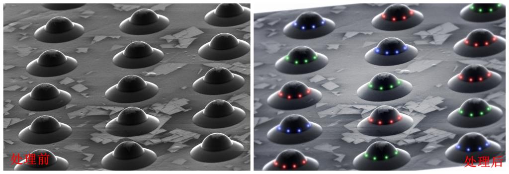图为扫描电镜下正在被加工的CeO2陶瓷压头,最顶端的“灯塔”便是压头的最尖端,图像在原有的扫描照片上进行了着色处理。