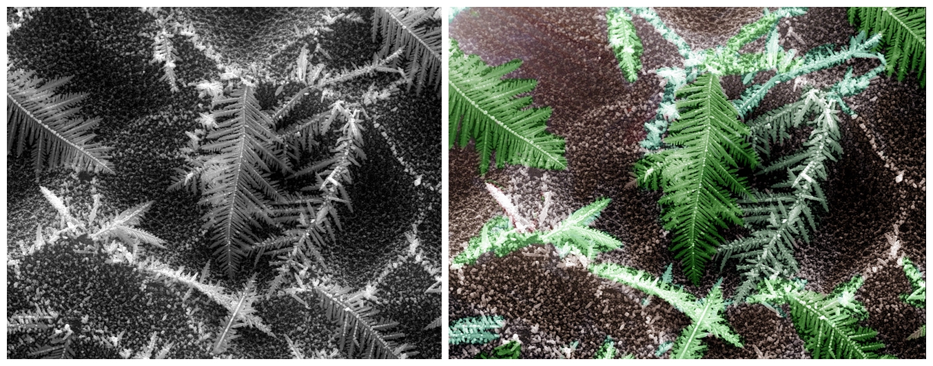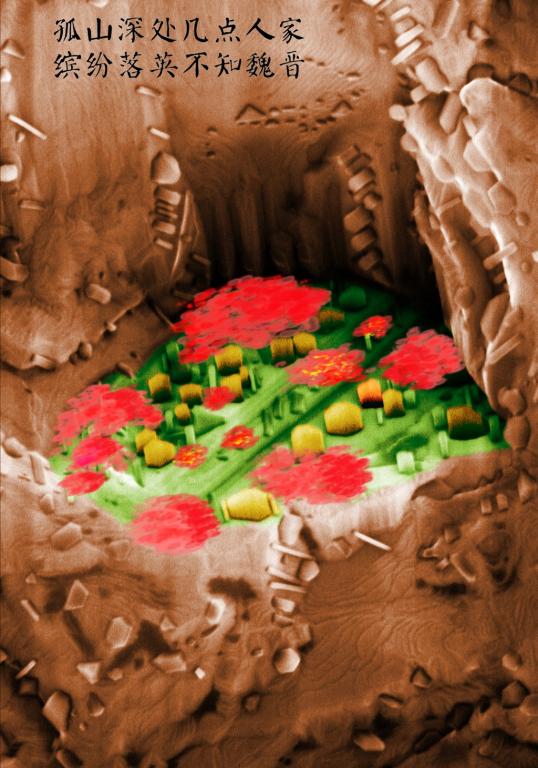 照片取材自碲化银在蓝宝石基底背面生长的扫描电镜照片,在原本照片上做了染色以及笔刷装点的处理。通过控制实验条件,碲化银在蓝宝石基底上生长出来众多短小类似树桩的形貌,拍摄者在基底的沟壑之间,寻找到了这样一块地方,形如山谷中隐藏的一处村落,隐约间如同桃花源在微观世界中再现。