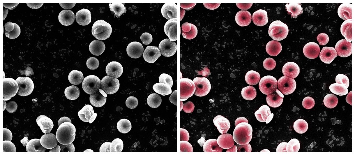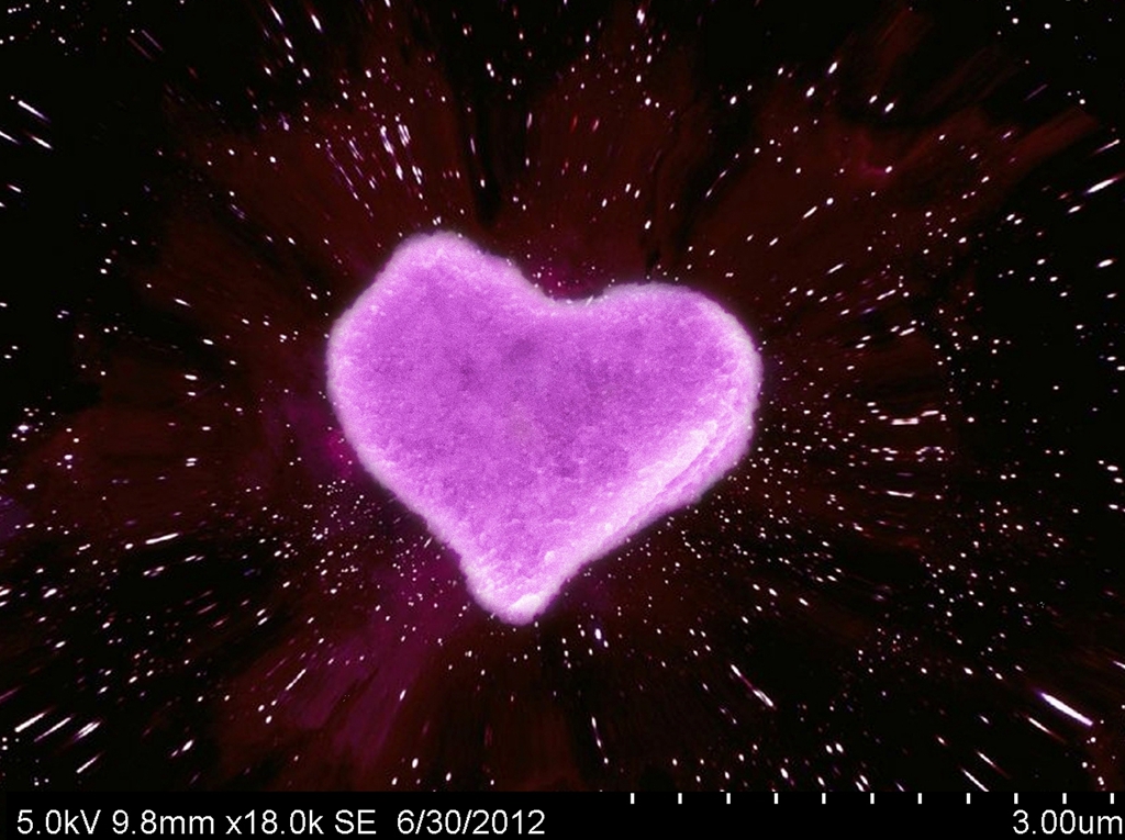 作者使用日立场发射扫描电子显微镜SU6600观察Ti02纳米颗粒形貌时发现心形的颗粒,经着色所得该图片,取名“星空下的爱”寓意浪漫美丽的微世界。