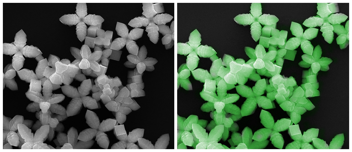 图为在扫描电镜下拍摄到的从空气中收集的富钠晶体微粒,在原始形貌的基础上,做了简单的着色处理。