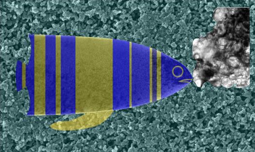 透射电镜图片蝴蝶鱼为含有超晶格结构氦泡的纳米栾晶铜微柱;其加热后有大的氦泡形成,貌似鱼嘴吐出的泡泡;珊瑚虫-扫描电镜照片为纳米结构钨。