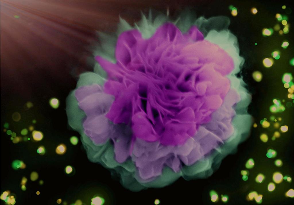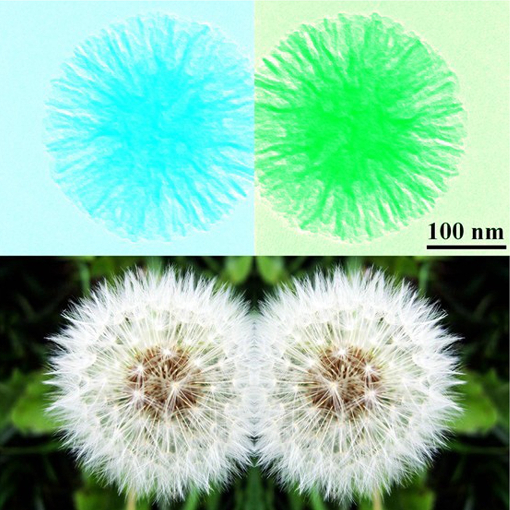 本图上半部分是在JEOL 2100F透射电镜下观察到的二氧化硅纳米球形貌经染色处理后得到,让观察者不由自主地联想到美丽绽放的蒲公英。