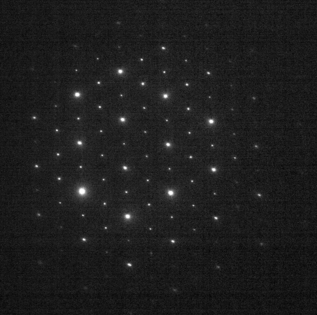 本图是在JEOL 2100F透射电镜中用PI51 ECR单倾杆拍摄到的二氧化帆纳米线的衍射斑,各个晶面的衍射斑阶次闪耀、衍射斑强度错落有致,表现出晶体结构之美,也让人联想到深邃的夜空。