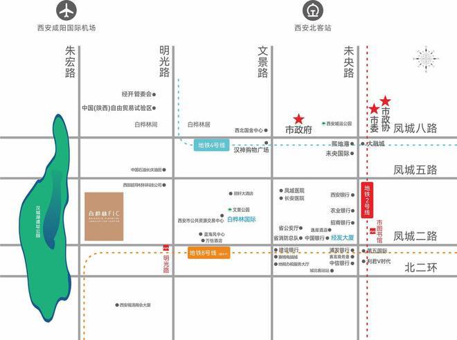 项目位于机场高速进入西安城区的门户位置,同时还处于经开区凤城二路商圈,近邻北二环,距市政府约2.8km,交通优势明显。距西安北站约6km,距离咸阳机场约18km,出入城市方便快捷。