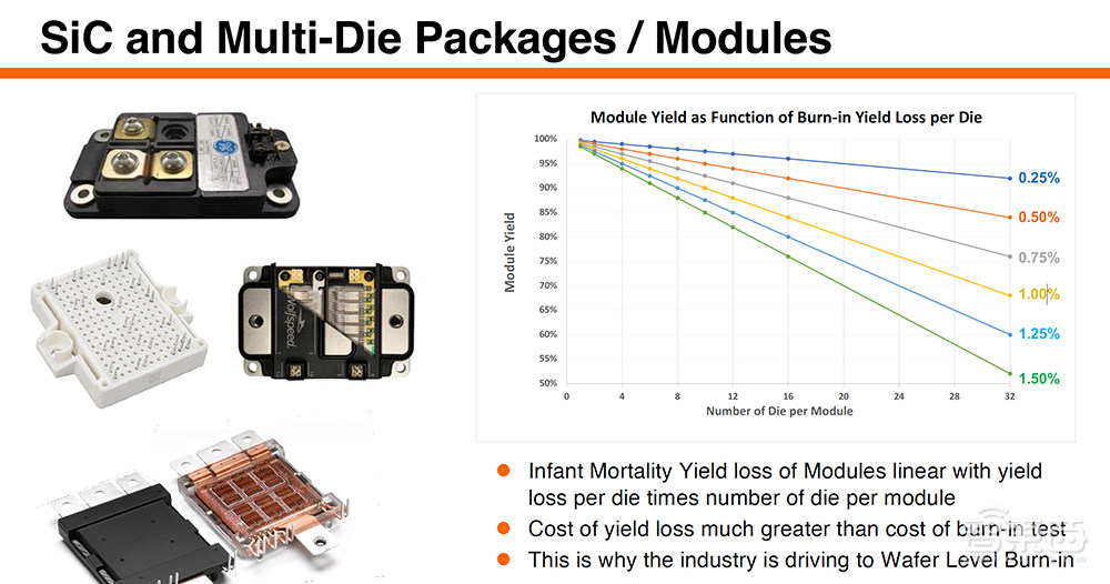 每个设备的汽车测试可能持续两到四天,测试数千台设备所需的时间将会特别长。大多数行业已经从分立功率器件转向多芯片模块。在这些情况下,一个坏的die可能导致许多好的die失败,在长达十年故障率为1%的情况下,标准12芯模块的故障率也将达到约15%。